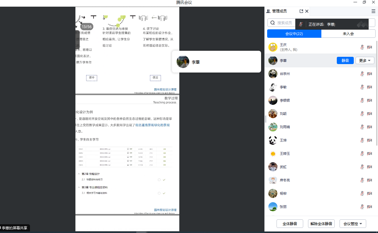 紧接着,由入围第二届教学创新大赛省赛的园林教研室副教授李蕙老师以其主讲课程《园林规划设计原理》为例,进行了一场生动详实的经验分享。她从课程创新的整体思路出发,细致阐述了她在教学内容深化、教学方法改革、教学评价体系优化等方面的具体举措,特别是在教学案例选择、教学团队组建和申报材料撰写等方面的独到心得。李蕙老师分享内容丰富、实用性强,为参会教师呈现了一堂生动且极具启发性的教学实践课,引发了在线参会教师们的热烈反响和深度讨论。