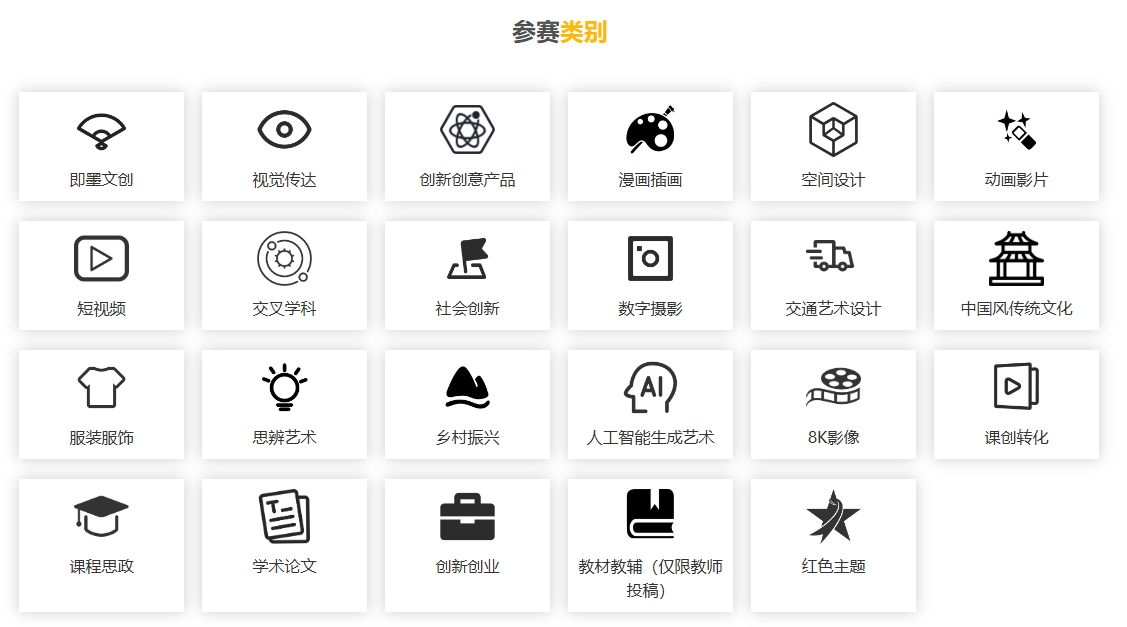 注意事项:按赛事组委会要求,二级学院每个类别参赛作品份数上限20件,人工智能生成艺术中的三个命题共计20件。对所投稿成果学院将组织专家教师进行遴选后提交。