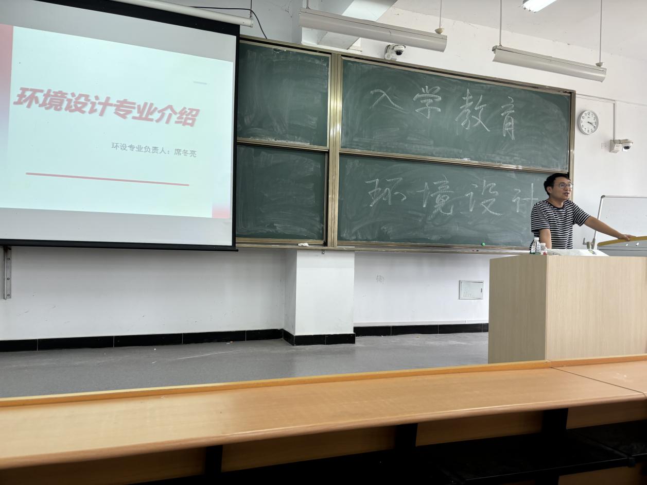 环设教研室副主任席冬亮围绕任课教师简介、专业概况、环境设计专业人才培养方案、特色工作室等方面进行了系统介绍。通过生动的讲解和详细的介绍,新生们对专业的发展情况、学习要求、就业前景等有了初步的认识,进一步明确了专业学习的目标和方向。这一环节不仅增强了新生对专业的认同感,也激发了他们探索未知的渴望。