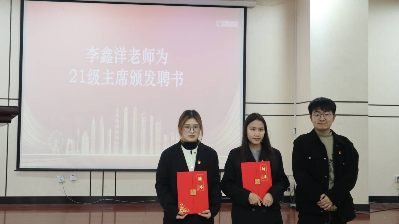 随后,全体成员起立奏唱共青团团歌。接着由第十届学生会各部门代表通过PPT讲解,回顾上一学年学生工作开展情况,并公布第十届学生会各部门的优秀代表。李鑫洋老师为第十届学生会主席团成员颁发聘书,第十届主席团成员为各部门部长颁发聘书,最后由各部门部长为部门新成员进行授牌。