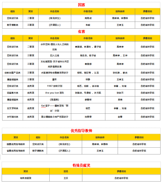 在比赛过程中,我院参赛项目展现了全面的创新能力,出色的团队协作能力,共获得国赛二等奖1项、国赛三等奖1项、省赛二等奖1项、省赛三等奖4项、省赛优秀奖5项,优秀指导老师奖2项、特殊贡献奖1项,总计15项大奖,充分展现了建筑与艺术学院学子扎实的专业知识、创新能力以及指导老师的策划与打磨能力。