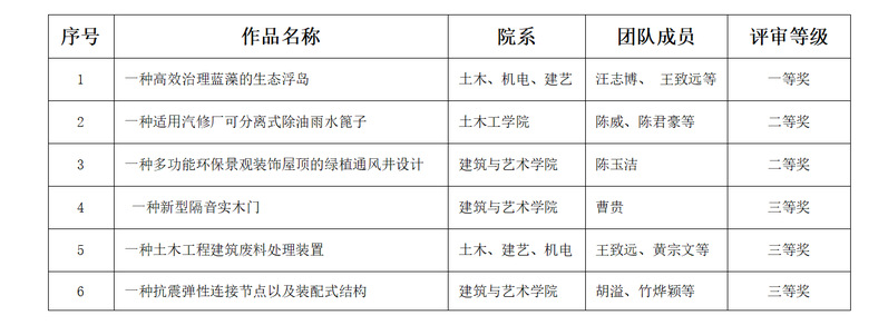 我校于2022年11月18日举办了第一届大学生专利大赛暨创意大赛,经大赛专家评委的公平、公正、公开的评审,产生一等奖1名、二等奖2名、三等奖3名的大赛成绩,具体项目及名称如下: