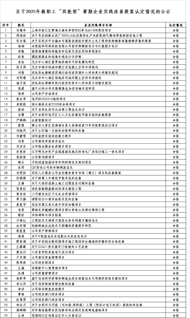 自组织2025年度教职工“双能型”暑期企业实践改善提案征集工作以来,科技处共收到64份有效材料。经校外专家的逐一评审,总共有55位教师的提案材料通过,通过率约为86%。