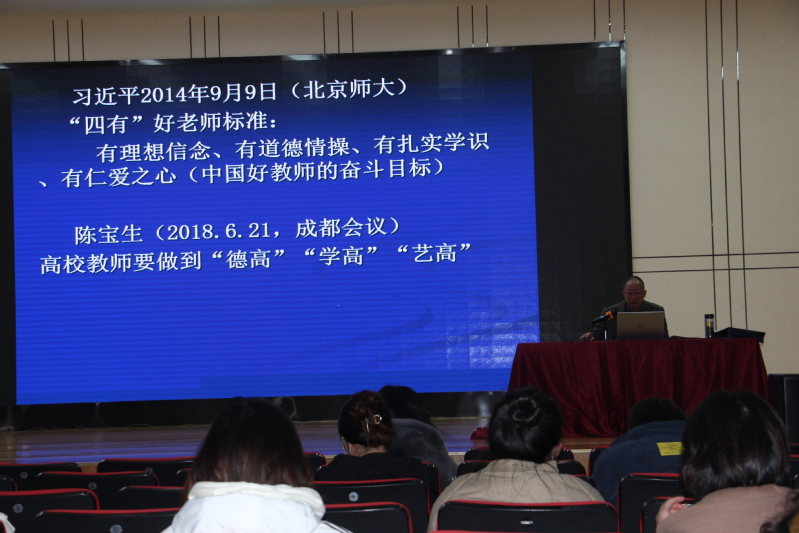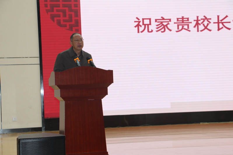大会第五项校长祝家贵进行题为“踔厉奋发,勇毅前行,做“三高”老师的专题讲授。他首先带领大家重温习近平总书记在北京师大提出的“四有”好老师标准,指出作为一名高校教育者,要做德高、学高、艺高的“三高”好教师。最后,他从四个方面要求各位新老师深刻领悟新时代中国好老师的丰富内涵,勉励青年教师充满爱心,忠诚事业,努力钻研,学为人师,以身作则,德高为范。希望青年教师要学以致用,不断耕耘,收获硕果。