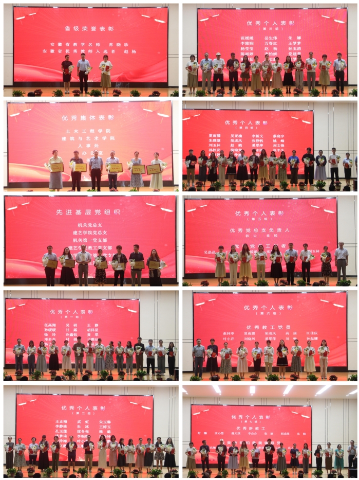 庆祝大会对2024年安徽省教学名师和安徽省优秀教师入选者、2023年度优秀部门、优秀个人、优秀共产党员、优秀党务工作者、优秀党总支负责人、先进基层党组织、2024年最美教师和最美辅导员进行表彰,校领导分别为获奖者颁发荣誉证书,学生代表为获奖者献上祝福的鲜花。