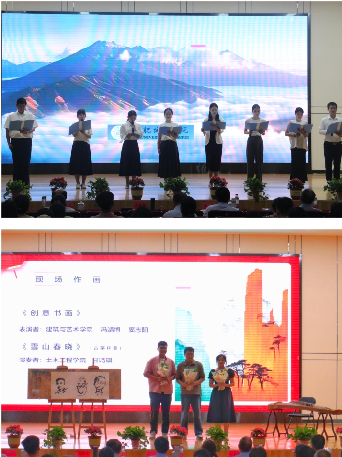 庆祝大会现场,教师代表和学生代表为全体教师献上诗歌朗诵《何以华夏、何以中国》和创意书画表演,激昂振奋的语言、优美动听的旋律、古筝与书画的创意结合,师生同台让我们享受了一场视听盛宴更展现了师生间深厚的情感纽带。