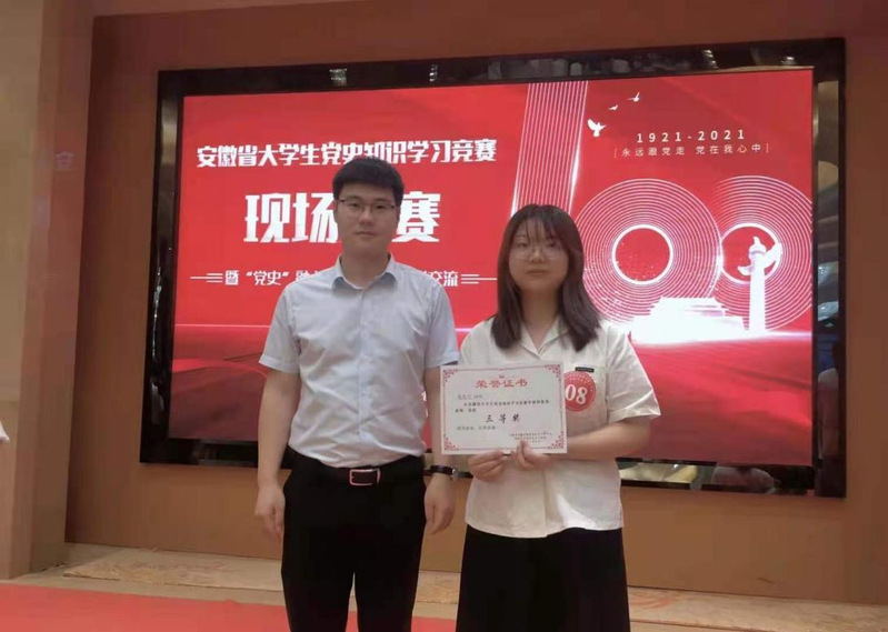 627日,由安徽省高校网络思政工作中心、安徽大学马克思主义学院主办——安徽省大学生党史知识学习竞赛决赛暨“党史”融入高校思政课教学交流活动,在合肥丰大国际大酒店成功举行。我校19级建筑电气专业的曹嘉雯同学在思政部王炎老师指导下,在决赛中喜获三等奖。