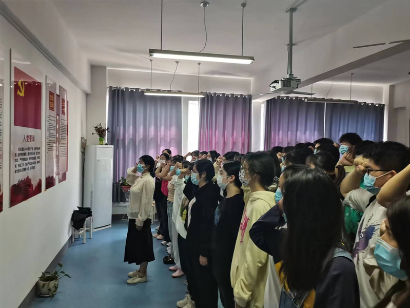 紧接着,王海英老师为同学们介绍道:“同学们,1921年我们党成立时,全国共产党员也只有五十多人,但就是这么多的共产党员不断发展壮大,带领中国人民进行了28年浴血奋战,推翻了三座大山,打下红色江山,建立了新中国。100年来,在中国共产党坚强领导下,英勇的中国人民经历从站起来、富起来到强起来伟大变革,中华民族已稳稳屹立于东方民族之林,中国共产党虽历经百年风雨沧桑,而百年恰似风华正茂,很多有志青年渴望加入中国共产党,今天我们在这里学习入党誓词,希望同学们不忘初心跟党走,砥砺奋进新时代!”