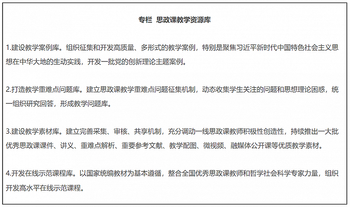 12.推进国家智慧教育平台建设使用。教育部把“大思政课”摆在教育信息化的突出位置,加强国家智慧教育平台思政教育资源建设。通过项目支持的方式,推动教学资源建设常态化机制化。组织开发和推荐一批科学权威实用的课件、讲义,推动一线教师统一使用。加强思政课教学资源库建设,实施中小学思政课精品课程建设计划,推出一批思政“金课”。加大优质资源推广使用力度,指导各地各校用好国家智慧教育平台。