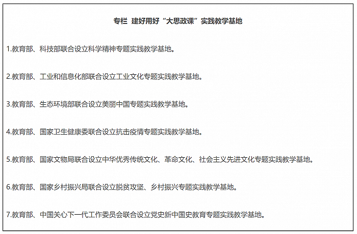 21.强化统筹协调。教育部、中央宣传部做好“大思政课”建设的总体谋划。中央网信办指导做好“大思政课”全媒体宣传。科技部、工业和信息化部、生态环境部、国家卫生健康委、国家文物局、国家乡村振兴局、中国关心下一代工作委员会等部门,加强对基地的指导和建设,切实发挥好基地的育人功能。