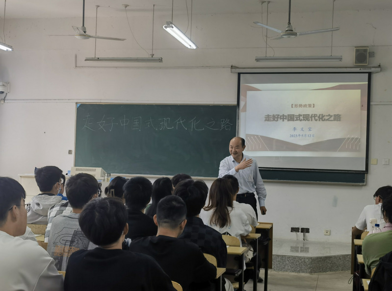 5月12日上午,纪委书记李义宝在东教学楼302教室,为22级土木工程专业学生开讲形势与政策课,他以《走好中国式现代化》为主题,重点聚焦以中国式现代化全面推进中华民族伟大复兴的使命任务,结合专业优势、突出学科特点,阐释中国式现代化的重大意义、本质要求、鲜明特色,旨在引导学生正确认识世界和中国发展大势,正确认识中国特色和国际比较,正确认识时代责任和历史使命,正确认识远大抱负和脚踏实地,争做有理想、敢担当、能吃苦、肯奋斗的新时代好青年。