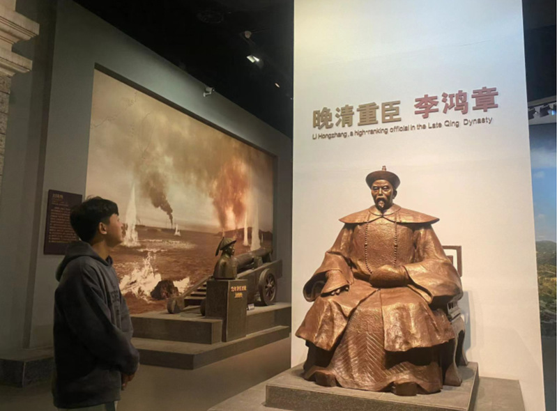 给人印象深刻的要数老子、赤壁之战和晚清重臣李鸿章了。当学生来到老子骑青牛过函谷关的一组场景时,纷纷扬扬的雪花飘落,似乎回到了数千年前,与古代先贤对话,仿佛是在向我们诉说着道家的经典。赤壁之战是两位安徽名人的较量,一艘巨大的楼船傲然屹立在惊涛骇浪中,战船之上丞相曹操故作镇定,赤壁绝顶少帅周瑜雄姿英发,江水翻滚,水柱冲天,声势浩大,真是“江山如画,一时多少英雄豪杰”。“晚清重臣李鸿章”通过精美的铜像制作,活灵活现的再现了当年历史厚重感。