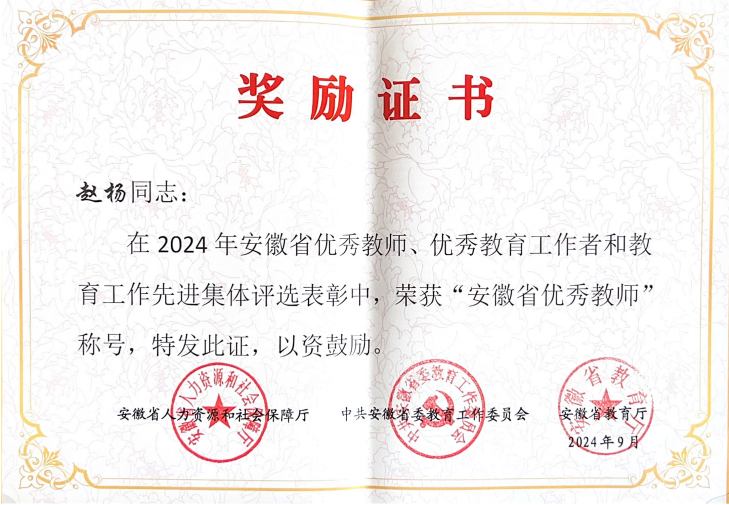 近日,中共安徽省委教育工委、安徽省教育厅公布了2024年安徽省优秀教师、优秀教育工作者和教育工作先进集体名单,我院赵杨同志荣获“安徽省优秀教师”称号。
