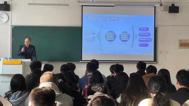 林瀚从“什么是新质生产力?为什么要发展新质生产力?怎样发展新质生产力?”三个问题导入,逻辑严密。他告诉同学们,当今科技迅猛发展的时代,依靠传统的要素投入、国际合作推动生产力发展的旧模式,已经远远不能适应当今时代推动中国式现代化发展的需要,必须要加快发展新质生产力,新质生产力发展路径有三种:第一,抓好新制造;第二,发展新服务;第三,培育新产业。