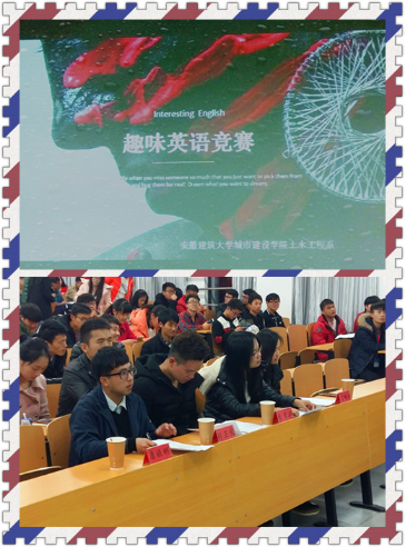 为迎接即将来临的英语四六级考试,12月4日,晚上6点在南教308教室,组织部和学习部首次合作作举办了土木工程系第一届趣味英语竞赛。此次比赛重在提高大家对学习英语的兴趣,同时享受一场不一样的视觉盛宴。经过大家充分的准备,土木系英语趣味竞赛正式拉开帷幕,出席本次比赛的评委有16级英语老师李月娟,土木系学生会主席刘正义,副主席舒启瑞,康晓彬,左梦君。