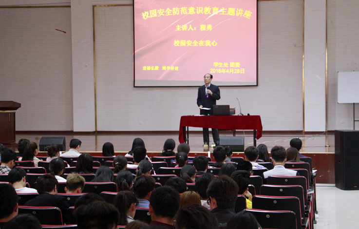 为增强同学们的安全防范意识,提高同学们的安全防范能力,全面普及校园安全常识,由我校程院长展开并主持的“校园安全防范意识教育主题讲座”于4月28日在图书馆二楼报告厅召开,我校各学生组织干部、班委积极参与此次讲座。