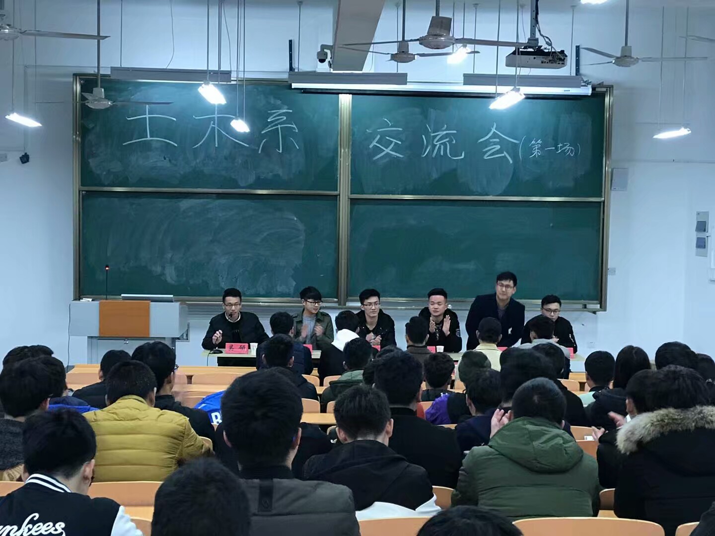 首先发言的是侯一鸣同学,他介绍了土木专业的前景,并告诉大家“强大的土木人永远站在我们的前方”,又用自己多年担任班长的经验告诉在座的学弟学妹要支持班委们的工作,要成为一个团结的集体;黄皖江同学详细介绍了自己在学习土木专业课程中最重要的三大力学的具体学习方法,分享了力学老师刘安中教授的一句话:“力学,就要用力去学!”与学弟学妹们共勉;吴振宇分享的则是他在学生会的心得以及给现在正担任学生干部的同学的建议,不忘初心,继续加油;张文豪同学介绍了自己在社团时的趣事,给大家分享如何权衡兴趣爱好和学习的关系;刘正义同学谈到自己在参加就业招聘会的体会时,在黑板上写下了五点对学弟学妹的宏愿:专注于专业知识的学习、清晰地认识自己、积极参加招聘会、认真做简历、合理投简历,这些知识无论是对于现在还是后来的就业,乃至未来人生的发展都有极大的帮助。他的发言引起了在场所有人的强烈共鸣,也将本次交流会推向高潮。
