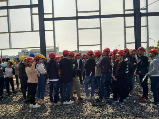 上午8时许同学们个个头戴安全帽在指导老师的带领下进入了施工工地现场,初到施工现场的同学们对钢结构风雨操场产生了浓厚的兴趣,纷纷结合自己在书本上所学的有关钢结构的知识对风雨操场的结构进行探讨。一番探讨之后富煌集团洪经理把大家叫到一起给大家介绍了有关风雨操场的基本组成部分以及各个组成部分之间的联系等相关问题,紧接结构设计师魏工向大家介绍了分风雨操场的钢结构设计原理和回答了大家在参观实习过程中的疑问。