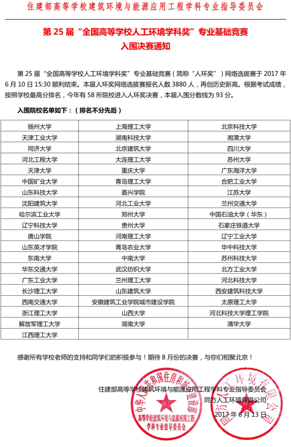 第25届“人环杯”网络选拔赛于6月10号顺利结束,我院土木工程系14建环专业代表队经过不懈努力和奋战,进入决赛。此次大赛由徐俊老师担任指导教师,带领本专业12名学生参加初赛。本届人环奖网络选拔赛报名人数达3880人,再创历史新高,此次比赛共有58所院校进入人环奖决赛。我院14建环专业刁园园、袁俊、康晓彬三位同学脱颖而出,以优异的成绩代表我院参加8月份“人环杯”决赛,比赛地点在北京。