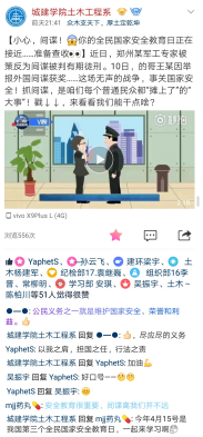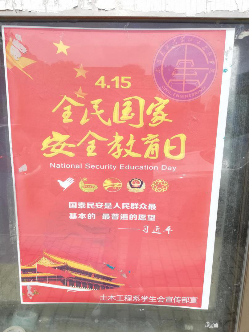 在4月13-15日期间,土木系学生会利用QQ公众号、微博、海报、横幅等方式,对国家安全教育日进行了多方面和多角度的宣传推广,宣传互动效果良好。