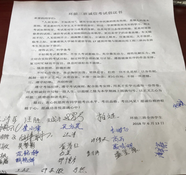 2018年6月,环能三班集体成员在班长白崟的带领下,于东教301教室开展了“诚信考试”的倡议活动。此次班会旨在提倡同学们树立诚信的良好品质,在生活中坚持“诚信为本”,养成讲诚信的好习惯。特别是在接下来的期末考试中,诚信考试尤为重要。