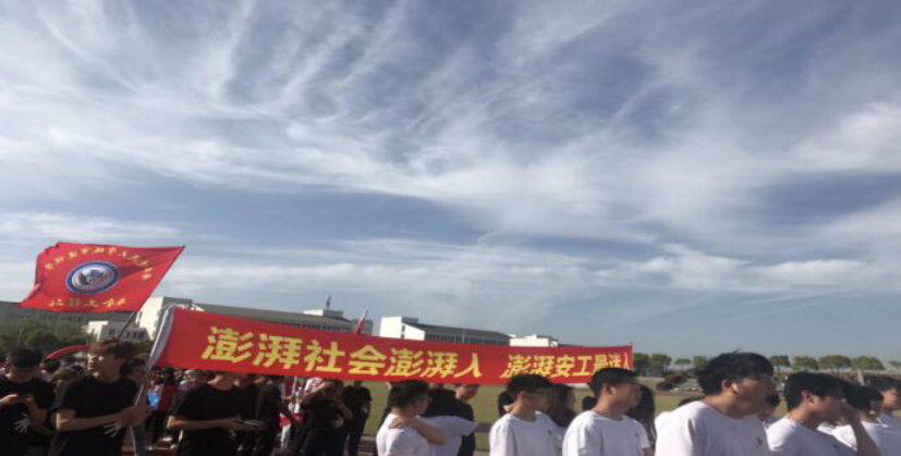 运动会开幕入场仪式火热进行中,18级安全工程二班的同学们整装齐发,体委热情挥舞着本班的旗帜。喊着响亮的口号“澎湃社会澎湃人,澎湃安工最迷人”!