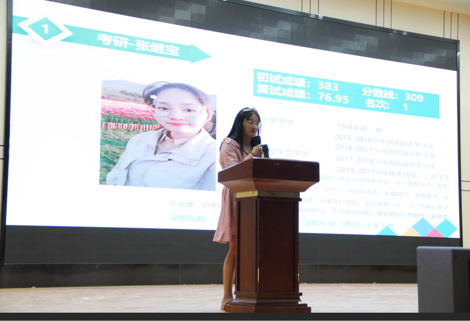 2019年5月28日晚7点,土木工程系优秀毕业生经验交流会在图书馆二楼大礼堂举行。出席的嘉宾有土木工程系党总支副书记范慧娟老师,土木工程系团总支书记、18级辅导员姚靖璇老师,以及考研优秀代表张继宝学姐、张广虎学长,考公优秀代表金鹏学长,就业优秀代表瞿康青学长。