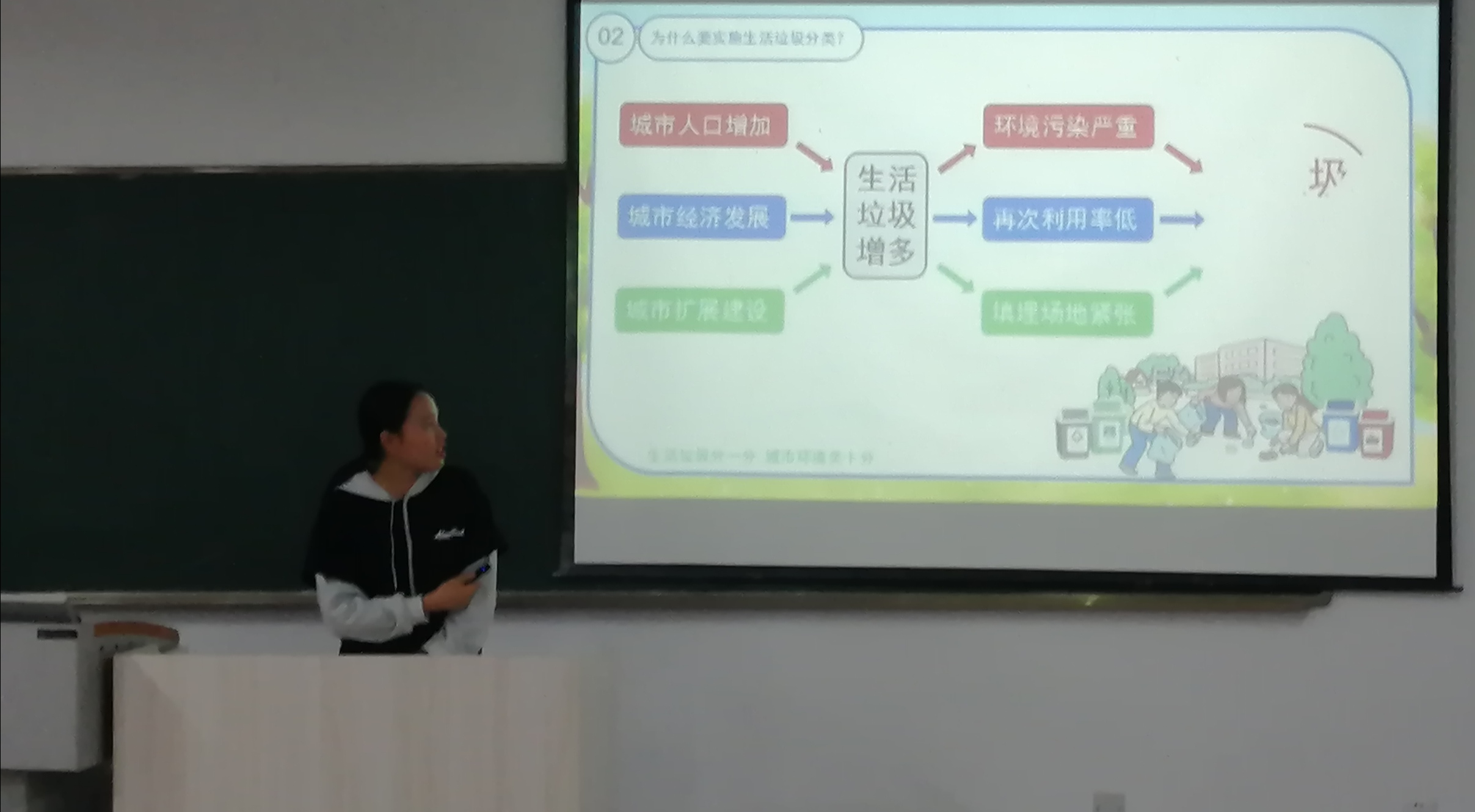 首先生活委员徐李燕对本次班会进行详细讲解。主要分为四大部分:什么是生活垃圾?为什么要分类?如何分类以及生活垃圾分类体系建设,目的是为了让同学们了解到如何正确对生活垃圾处理以及做到环保。