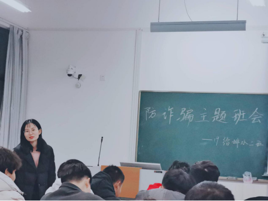 随着网络的普及和科技的发展,层出不穷的电信网络诈骗手段让人防不胜防。因为缺乏生活经验、思想单纯,大学生群体成为了电信诈骗受害的重灾区。针对这项问题,12月2日晚,19给排水二班辅导员吴雅婷老师特此开展了“防范电信网络诈骗”主题班会,学生处处长林岳老师也前来观看了此次班会。