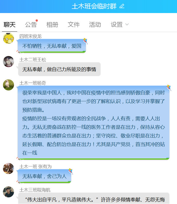 此外,本次班会就3月9日全体师生观看的全国“思政”大课进行了讨论,土木4班班长吴静带领大家进行。同学们结合思政大课就“面对这场突如其来的疫情,结合思政课本,请讨论社会主义社会在这场抗疫行动中显现出了哪些优势?”“这场战疫当中,在投身到一线的所有工作人员是无私且伟大的,那么作为大学生的我们从他们身上学习到了哪些精神或者受到了怎样的熏陶”“居家防疫期间,你是如何投身到这场全民抗疫工作当中的这三个问题展开讨论。