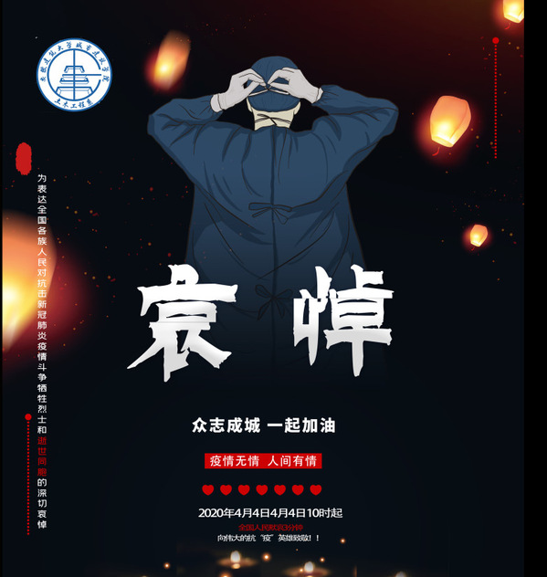 为表达全国各族人民对抗击新冠肺炎疫情斗争牺牲烈士和逝世同胞的深切哀悼,国务院于2020年4月3日发布公告,决定2020年4月4日举行全国性哀悼活动。响应国家号召,哀悼抗“疫”战争中牺牲的伟大英雄,铭记他们的为人民做出的巨大奉献,安徽建筑大学城市建设学院土木系学生会组织开展对 “抗疫”英雄进行线上哀悼活动。
