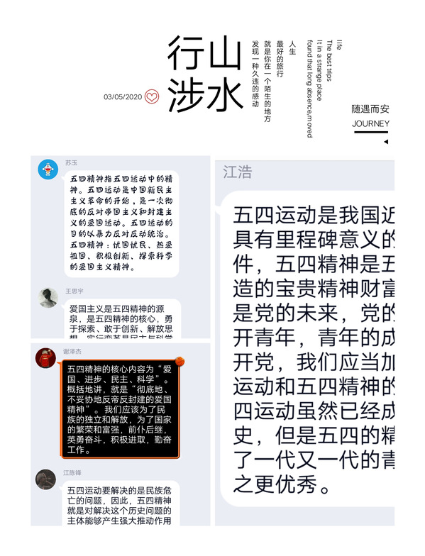 通过线上的形式同学们在班级群里都进行了积极的发言并且发表了他们的看法,她们或许懂得了青春的含义,也或许更加能理解青春代表了什么。它代表了生机与活力,承载着未来和希望。习近平总书记强调:中国的未来属于青年,中华民族的未来也属于青年。1919年5月4日,英勇的青年学生以其爱国行动书写了一首隽永的青春史诗,形成了激励代代青年奋勇前行的“五四精神”。近百年的风云变幻,“五四”甚至已超越了其所诞生与嵌入的历史,成了一种' '超时空”的永恒存在,推动着无数爱国青年在奋斗中交出无愧于时代和人民的合格答卷。