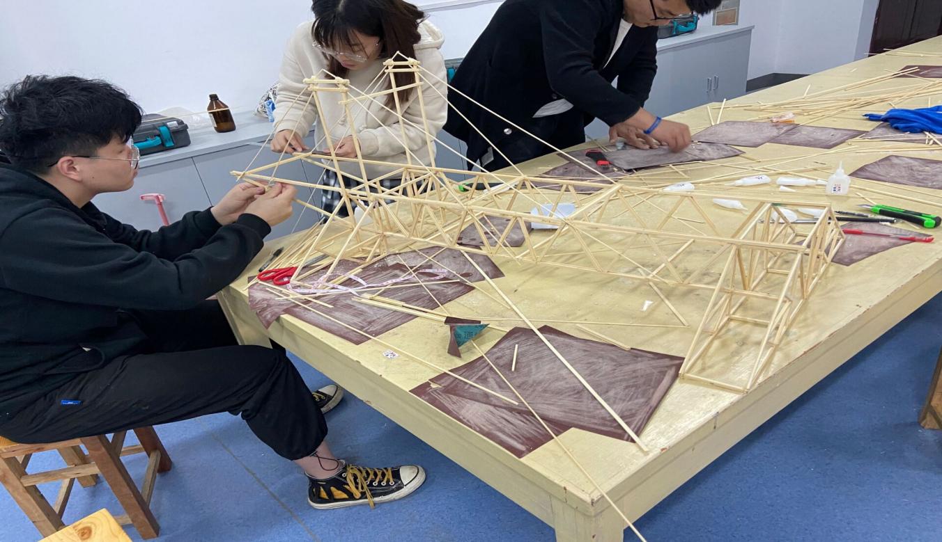 终于,竞赛的日期临近,由于没有加载装置,每位成员的心中忐忑不安。最后一次的机会,同学们带着做好的模型,去安徽建筑大学南区进行最后一次加载。很不幸的是,模型都没有加载成功,这时,离比赛只剩一个夜晚的时间。同学们咬咬牙,吸取最后一次的加载经验,结合老师的指导意见,决定留在安徽建筑大学实验室。哪怕只剩这一夜的时间,也一定要再做出一个能过加载的模型。就这样,漫漫的长夜,对于他们来说,却弥足珍贵。