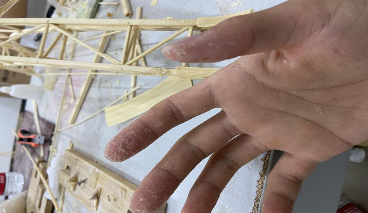 衣服上布满木屑灰尘,双手被胶水粘住灼烧,就连手机的指纹都不能识别,这是每位成员每天都要经历一遍的。每每夜晚做完模型十一点回到寝室,总要在水龙头下冲洗半个小时,抠掉手上凝固的胶水,只为了第二天能够更好地连接木条,每日如此反复。正是因为每位成员的心中都有梦,才能如此坚持一路。