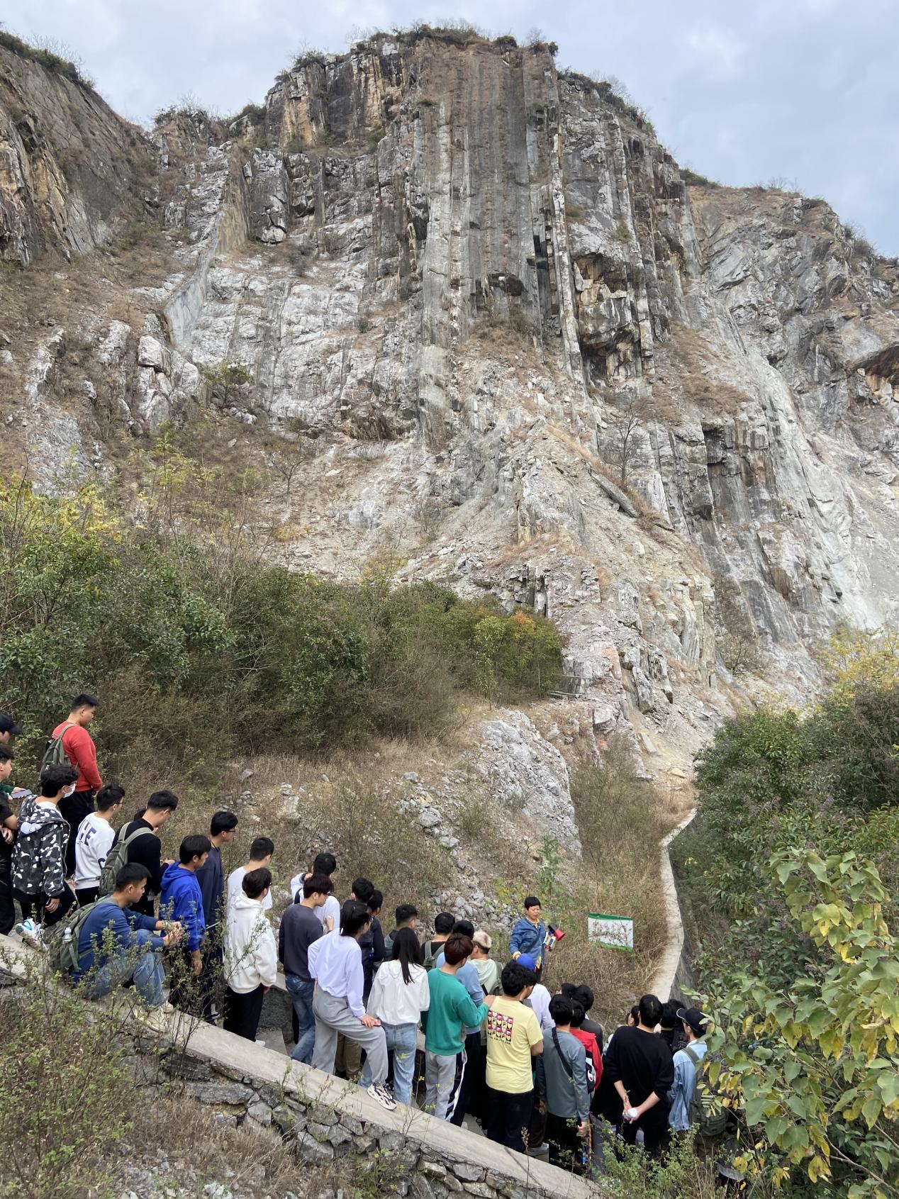 下午,实习第四站——麒麟山,在老师的带领下同学们沿着一条小道上山,同学们在山上和老师观察岩石的岩性特征及其接触关系,并测量数据,并观察其背斜形态。