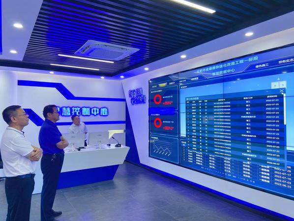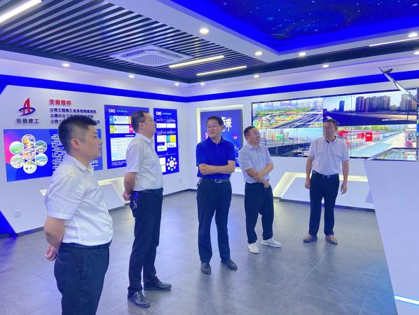 马建国一行在安徽省公路桥梁工程有限公司金寨路项目总工贾瑞坤带领下参观路桥公司金寨项目部智慧控制中心展厅、党建活动室、职工书屋、职工之家等,听取金寨路项目概况介绍。金寨路高架1标段桥长1694m,共15联,上部结构为现浇砼箱梁和钢箱梁,砼量达4.5万方。通过BIM+GIS技术模拟下穿施工全过程,优化施工方案,提前两个多月实现主线桥通车放行。利用BIM技术展现示金寨路互通项目的全方位、全过程施工管理,近距离感受智慧工地成果。