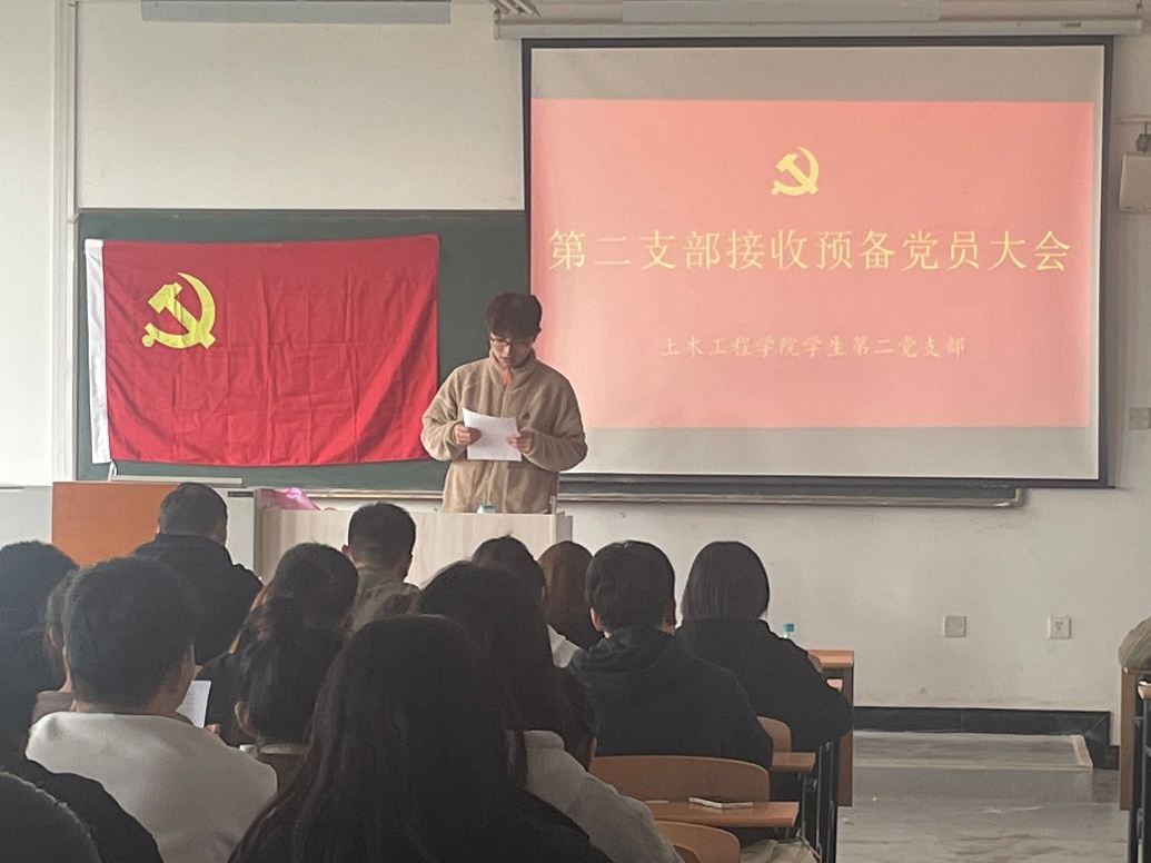 近日,为壮大支部党员队伍,凝聚青春新力量,土木工程学院学生第二党支部于2022年11月25日南教104召开支部大会,讨论接收中共预备党员事宜。土木工程学院学生第二党支部全体党员,预备党员共同参加此次会议。本次会议由支部书记吴晶晶同志主持。