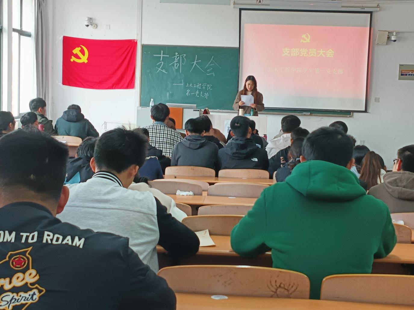 为壮大支部党员队伍,增强支部组织活力,为党组织汇入新鲜血液,土木工程学院学生第一党支部于2022年11月24日下午两点在南教106教室召开支部大会,讨论接收中共预备党员事宜。本次会议由支部书记吴紫珺同志主持。