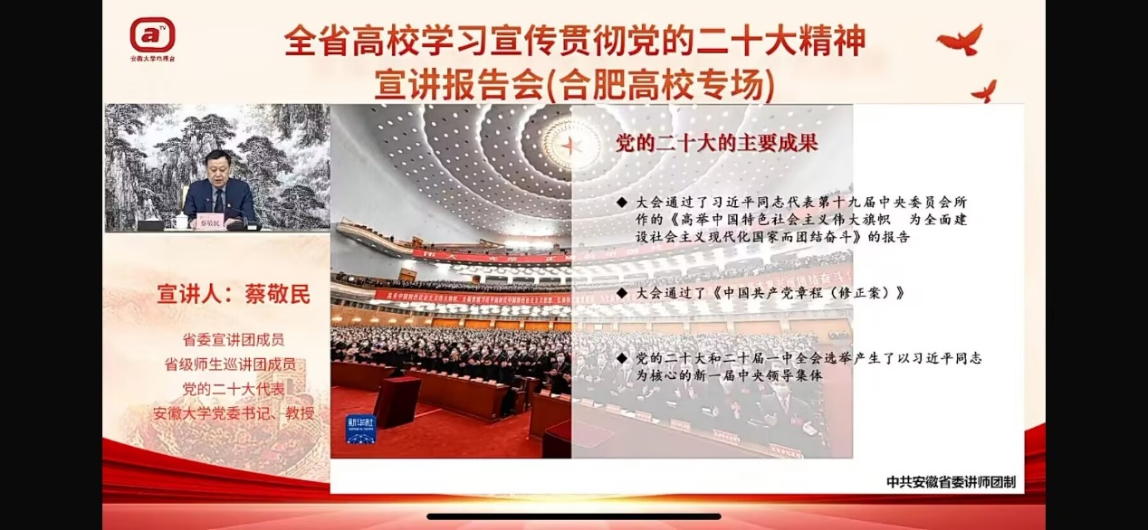 安徽大学党委书记蔡敬民教授从“深刻把握过去5年党和国家事业取得举世瞩目的重大成就、深刻领会新时代10年的伟大变革及其里程碑意义、深刻领会新时代伟大变革的根本原因、深刻领会中国是现代化的中国特色”等多方面对党的二十大精神进行了深入宣讲解读。