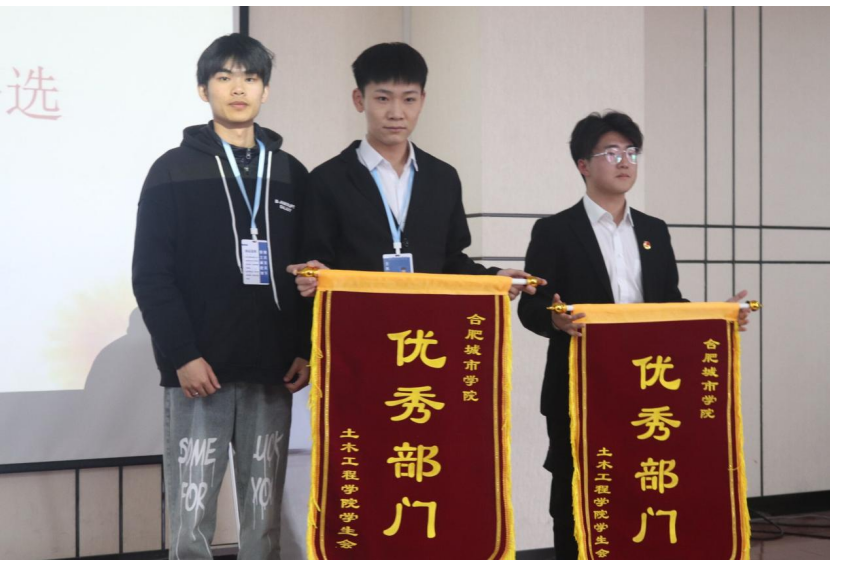 大会第三项:表彰人员和部门。主持人张雨洁宣布了土木工程学院学生会优秀部长:邓欣洋,宋嘉伟,随后公布了优秀干部和优秀干事的获奖名单。由土木工程学院学生会执行主席张凯歌,主席赵闻起为他们颁奖。在现场,经各部门负责人投票评选,最终学习部和社会实践部摘下桂冠获优秀部门奖;宣传部获得服务同学精神成长奖;社会实践部同时也获得了创新进步奖,张凯歌和赵闻起分别为获奖部门颁奖。