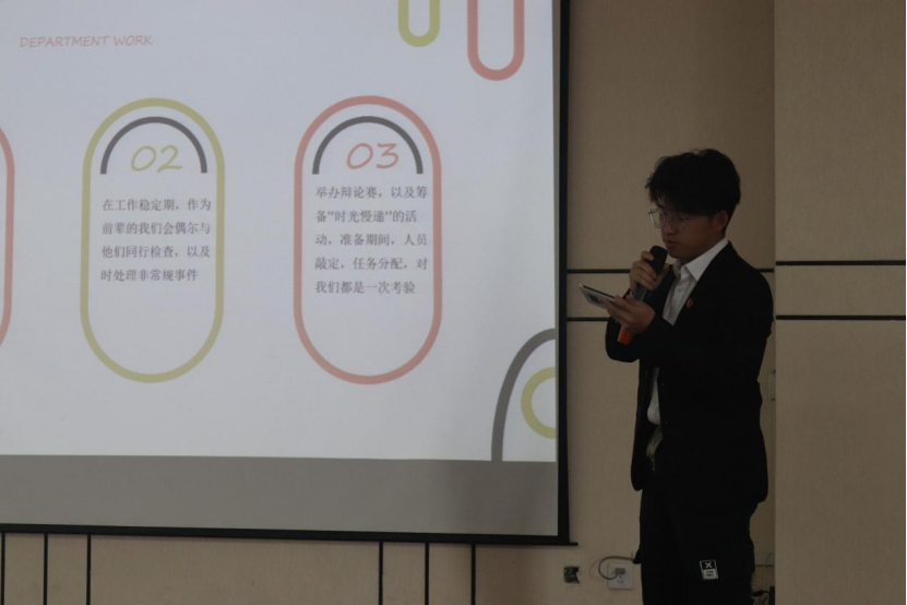 大会伊始,全体成员起立奏唱团歌。大会的第一项:执行主席张凯歌对土木工程学院学生会第一学期的收获以及不足进行了总结。大会第二项:各个部门的负责人对第一学期工作的情况和活动中出现的问题做了汇报,同时还讲述了对未来工作的规划。