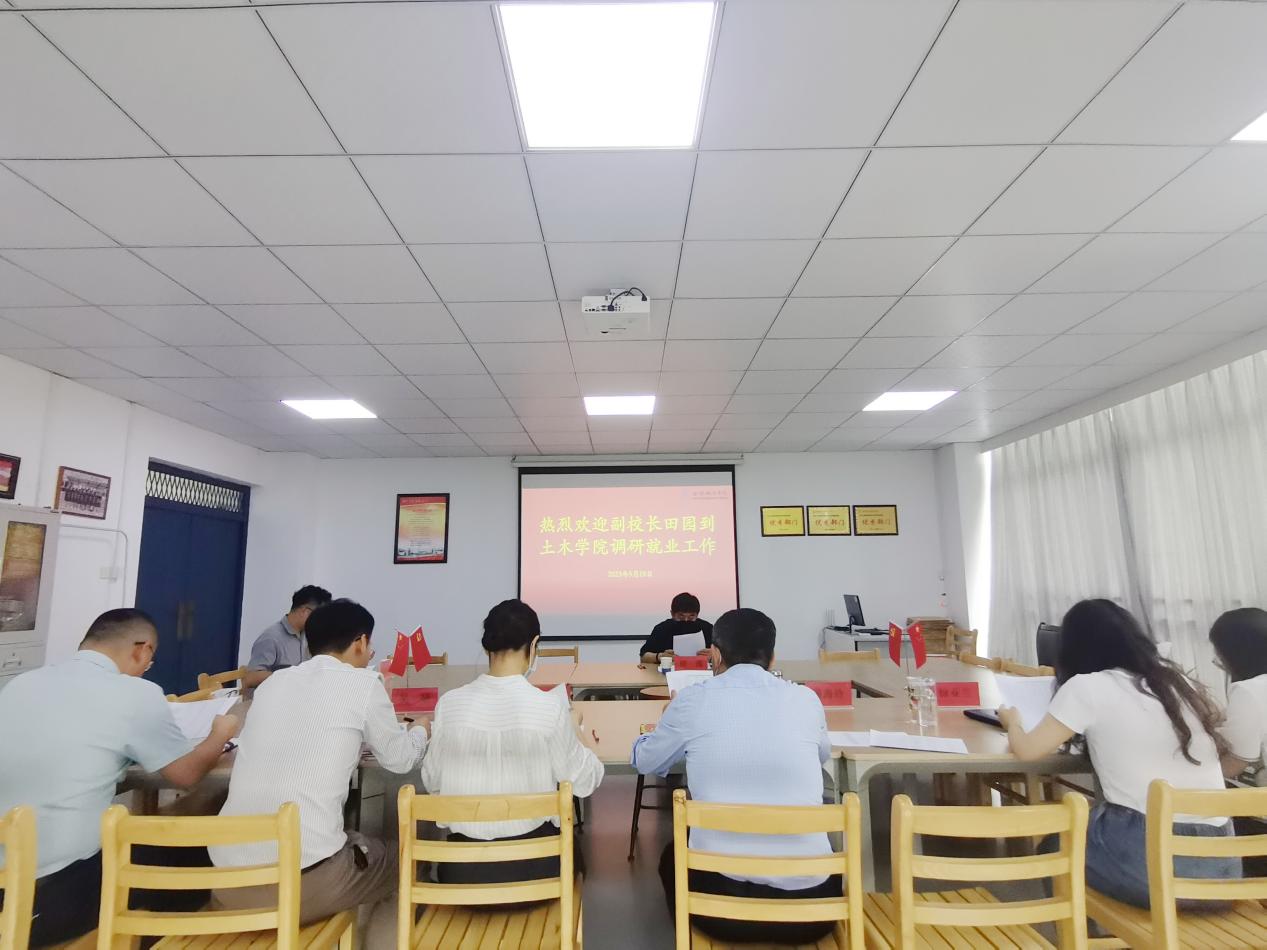 2023年5月19日下午3时30分,副校长田园到土木工程学院调研指导就业工作并召开座谈会,土木工程学院院长雷庆关、党总支副书记张敬知、院长助理吴研以及全体毕业班辅导员参加座谈会。