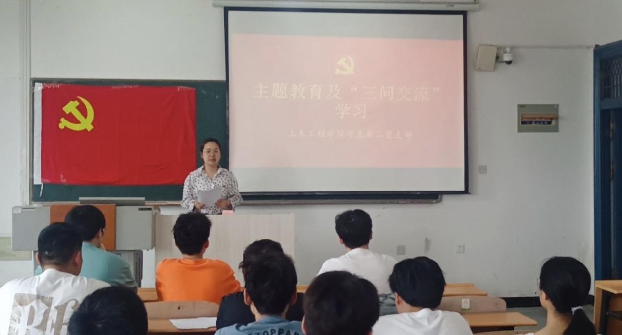 为深入推进学习贯彻习近平新时代中国特色社会主义思想主题教育,5月30日,土木工程学院学生第二党支部召开学习贯彻习近平新时代中国特色社会主义思想主题教育学习会暨“三问”交流会,全体党员参加学习交流会,会议由学生第二支部书记江佳庆同志主持。