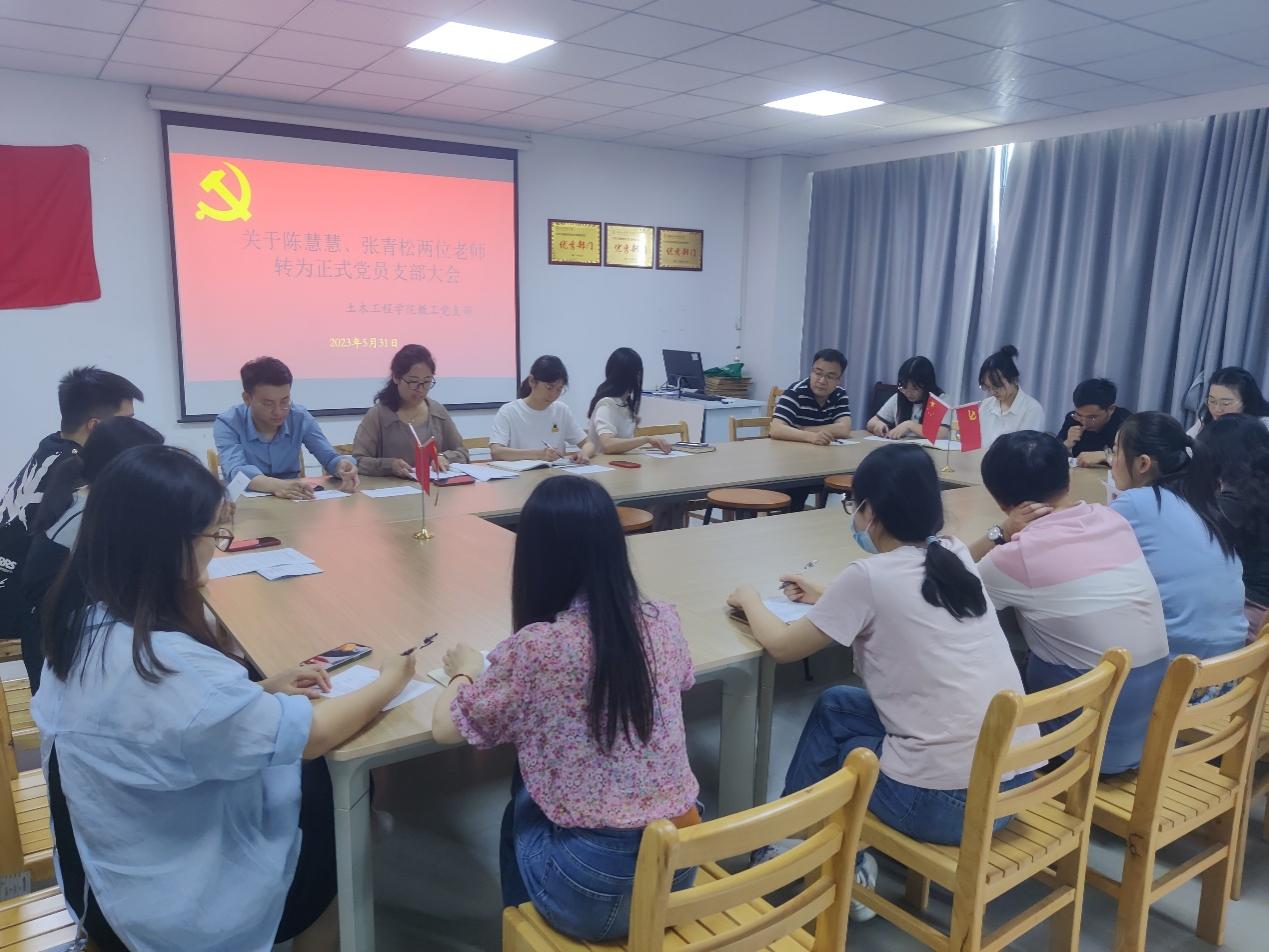 2023年5月31日下午,土木工程学院教工党支部于实验楼北302召开关于陈慧慧、张青松两位老师转为正式党员支部大会。本次大会由土木工程学院教工党支部书记王静同志主持,有表决权的到会人数超过应到会有表决权人数的半数,符合大会规定。