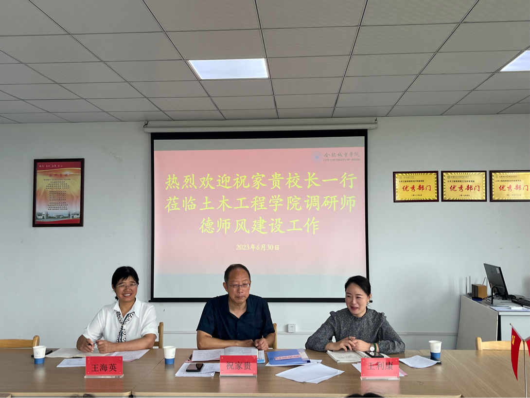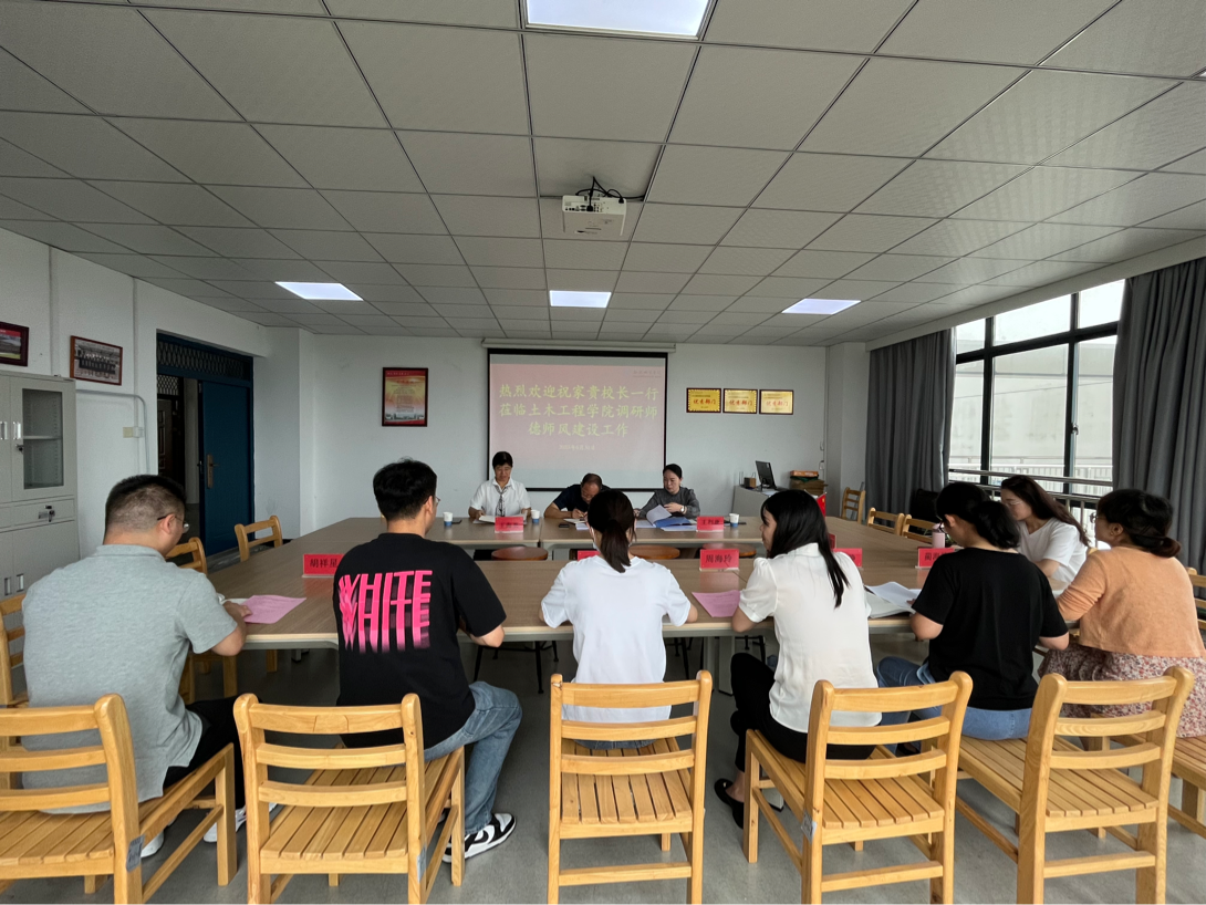 2023年6月30日上午,校长祝家贵率领校纪委副书记王利康、马克思主义学院副院长王海英一行到土木工程学院督导师德师风建设专项排查治理工作,土木工程学院院长雷庆关及领导班子成员、教工党支部书记、各教研室负责人参加座谈会,会议由学院党总支副书记张敬知主持。