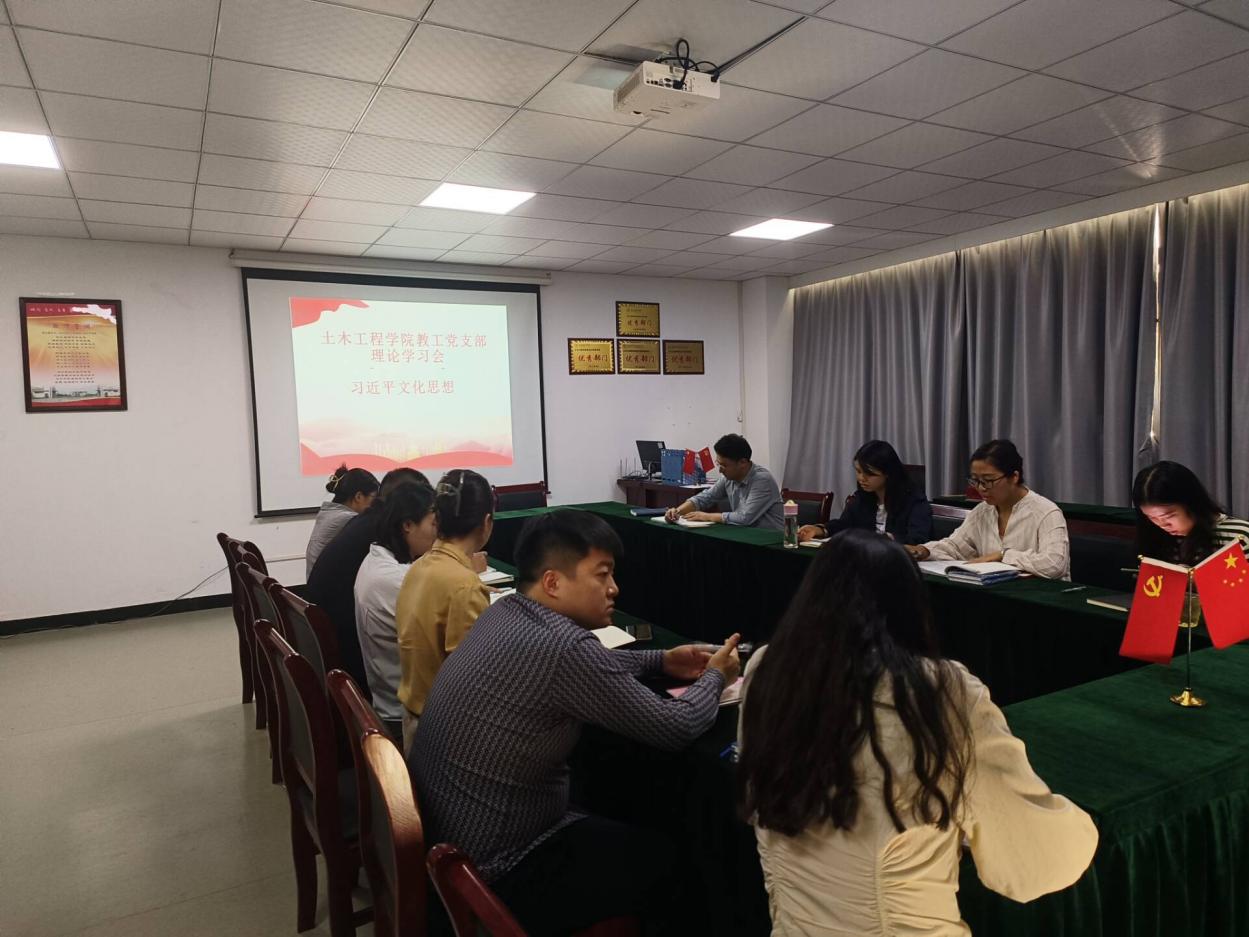 2023年11月9日,土木工程学院教工党支部在实验楼北302教室开展学习贯彻习近平文化思想理论专题学习会。会议由土木工程学院教工党支部书记王静同志主持。