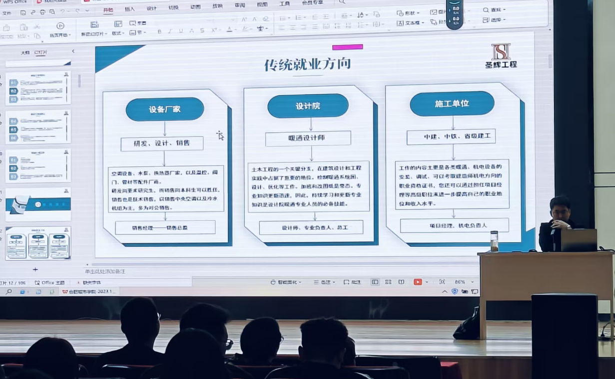 黄伟分别从环能专业的理解、传统就业方向、高阶就业方向、毕业前的就业准备等多方面进行了详细的讲解。目前环能专业毕业生的大多数就业方向为设备厂家、设计院、施工单位、普通企业运行管理、公务员事业编、地产公司等。