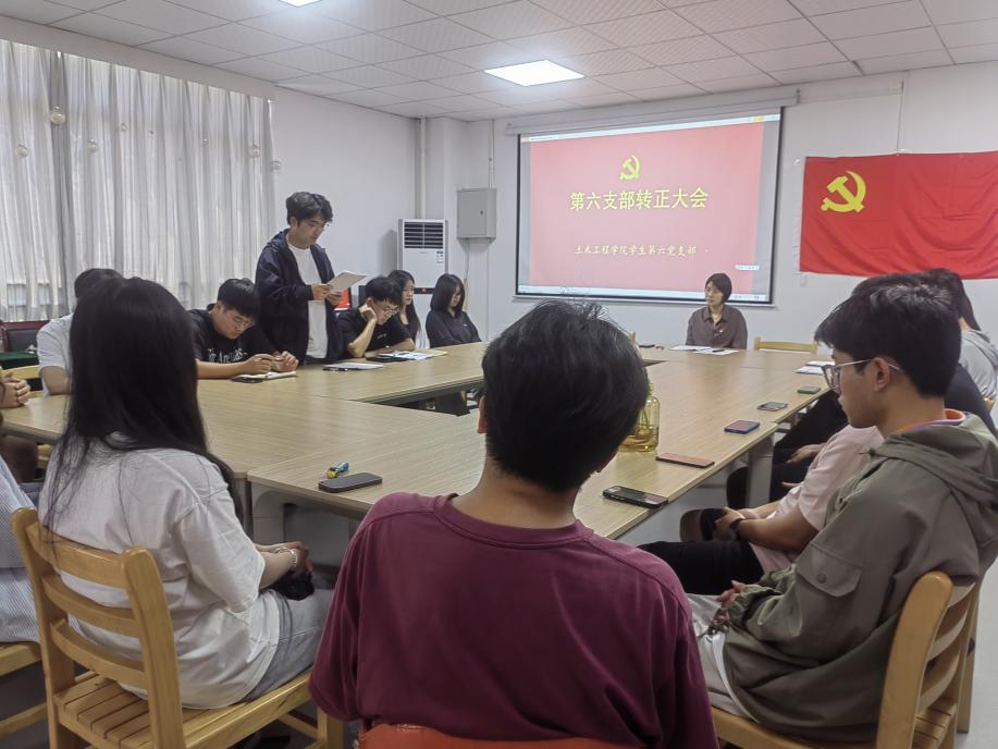 为增强党员队伍生机与活力,2024年5月23日中午12点30分,土木工程学院学生第六党支部在实验楼北202党员活动室召开预备党员转正大会,主要讨论刘志凯、朱若宇、闫俊豪、孙梦阳四位同志的转正问题。会议由学生第六党支部书记何诗凤书记主持。