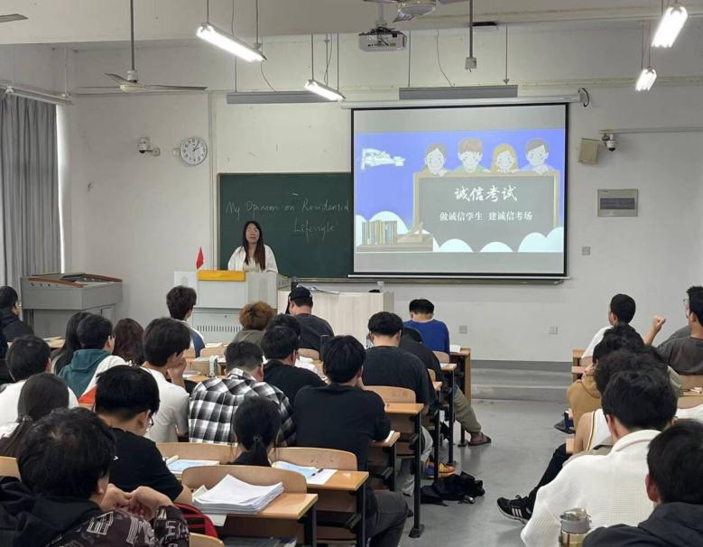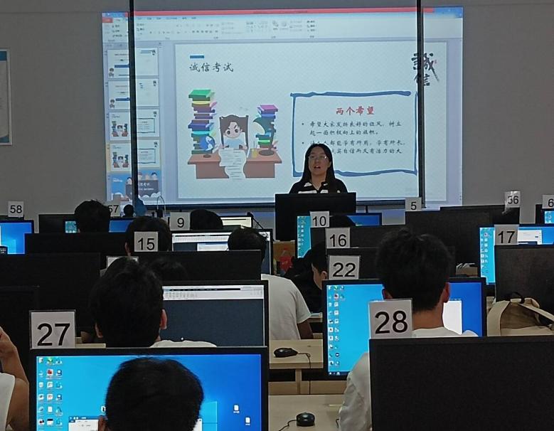 吴晶晶老师详细介绍了考试中的注意事项和违规行为的处理办法,让同学们更加清楚地了解了考试纪律和规定,进一步增强了学生的诚信意识。随后,由吴晶晶老师将诚信考试承诺书发放到各班级,各班长带领大家学习诚信考试承诺书的相关规定,明确相关要求,提醒注意事项,每位同学都在承诺书上郑重签名。