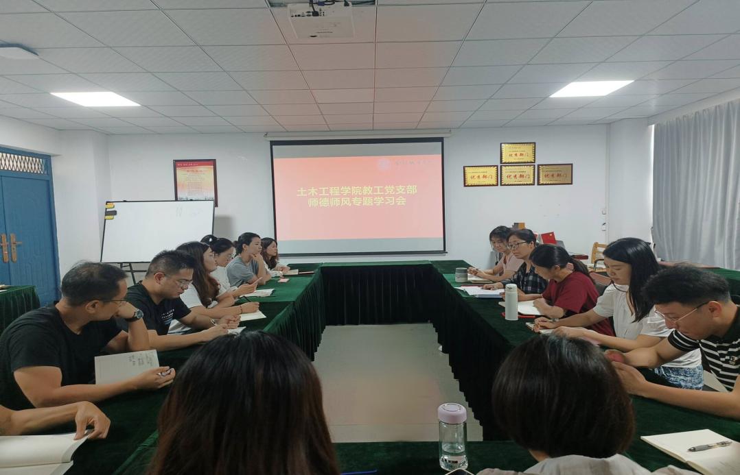 为深入学习贯彻党和国家关于师德师风建设的重要指示精神,进一步强化教师队伍的职业道德意识,提升教育教学质量,营造风清气正的育人环境。土木工程学院教工党支部于2024年9月19日下午,在实验楼北302会议室开展了“师德师风专题学习会”。会议由支部书记王静同志主持。